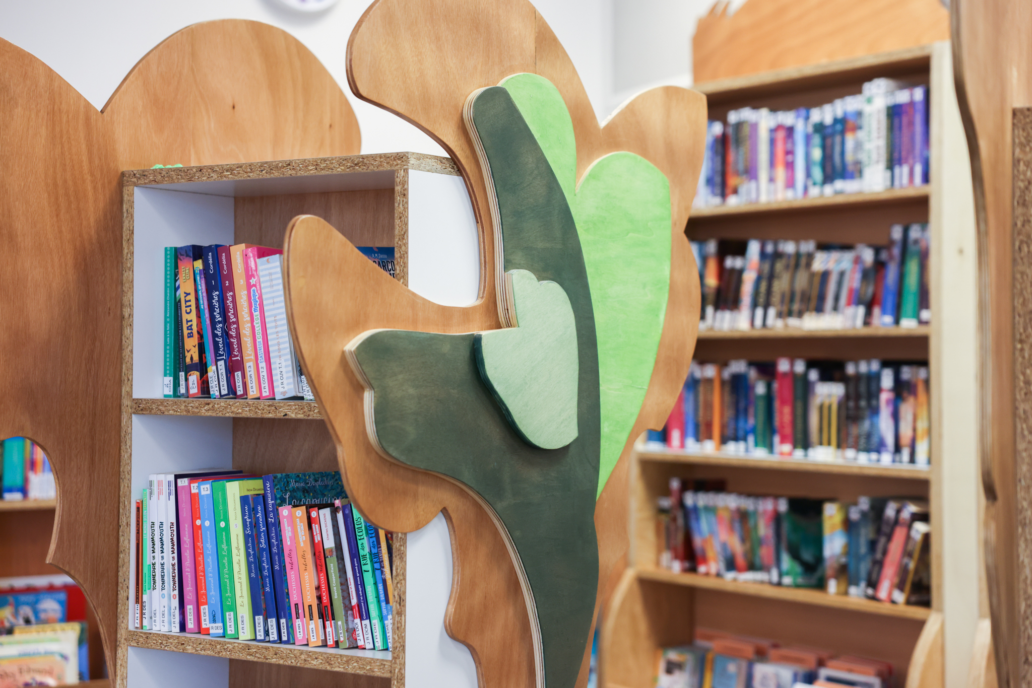 Le cœur de la bibliothèque a été pensé pour les enfants. Une grande arche en bois accueille les jeunes lecteurs, comme une porte vers une forêt enchantée. La cabane à livres à double niveau invite parents et enfants à lire ensemble, pour favoriser le partage et les bons moments en famille. Des étagères en forme d’arbres créent des coins protégés pour les jeunes lecteurs, tandis qu’une estrade face au jardin devient le lieu idéal pour les lectures et contes réalisés par les bibliothécaires. « Cela donne envie aux enfants de s’intégrer directement au groupe, c’est très convivial », sourit Corinne.