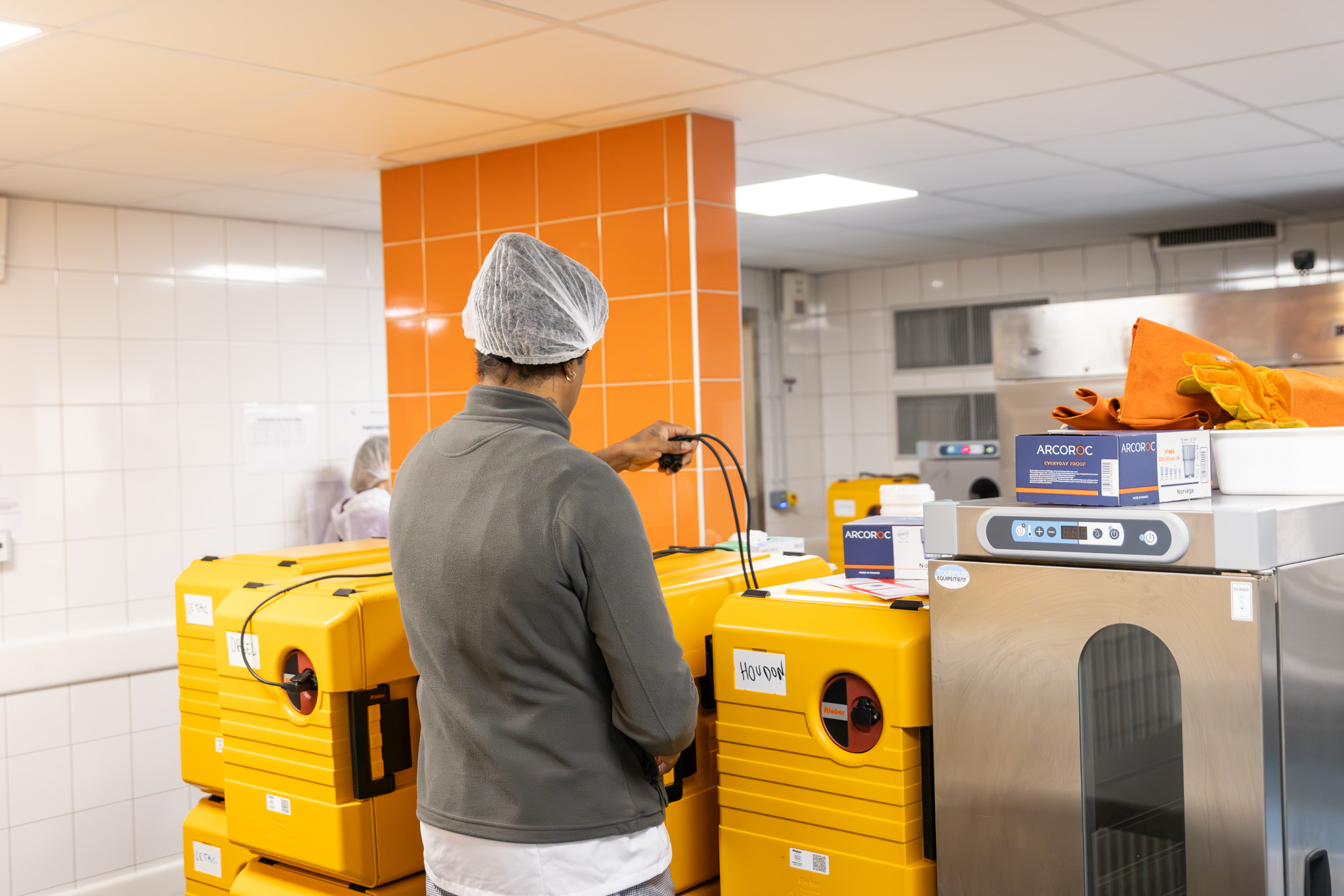 La production commence à 7h et se termine aux alentours de 10h. Chaque plat est placé avec soin dans des caissons chauffants, la température vérifiée entre 63 et 86 °C pour les liaisons chaudes, tandis que les entrées et les yaourts prennent place dans des conteneurs froids. Les chauffeurs-livreurs prennent ensuite le relais pour assurer les livraisons en véhicules éléctriques avant 11h dans les écoles.