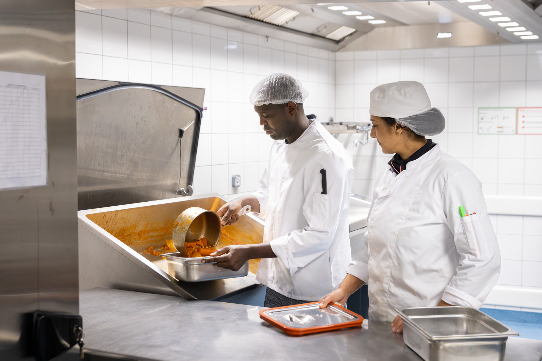 Blouse sur le dos, charlotte sur la tête et sur-chaussures aux pieds, la visite peut commencer. Dans la cuisine de l’école Jean-Baptiste Clément, l’activité bat son plein. Depuis 7 h ce matin, les équipes sont à l’œuvre dans cet espace rénové, devenu un site central de production pour les écoles voisines. Aux commandes de cette cuisine, David, chef cuisinier, coordonne chaque geste.