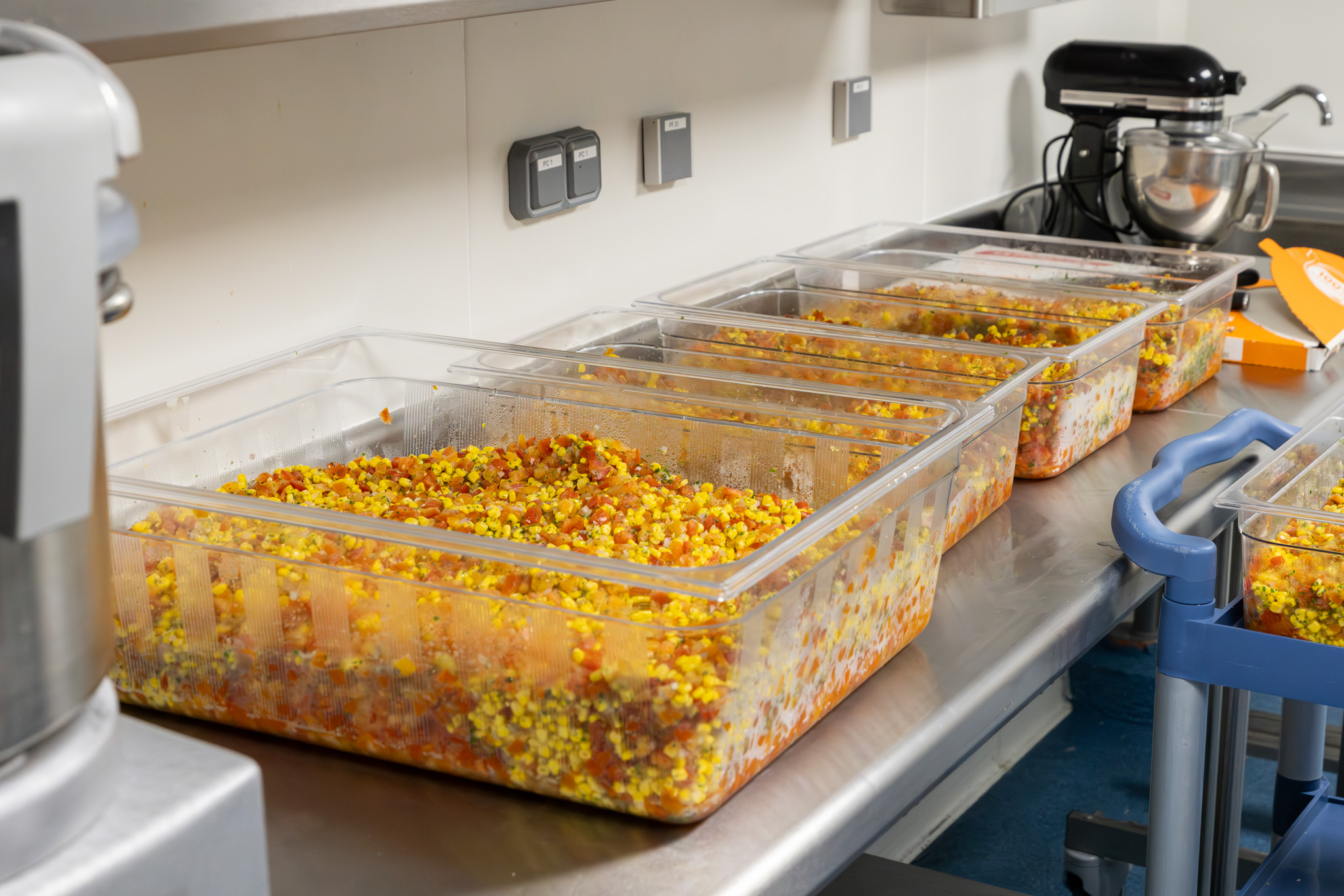 La journée démarre dans la zone de production chaude, équipée de deux sauteuses et d’une cellule de refroidissement. Les légumes bruts sont lavés et préparés sur place. Au menu du jour : un tiep végétarien, une nouvelle recette qui emplit la cuisine d’arômes et connaît aussi un franc succès auprès des enfants.