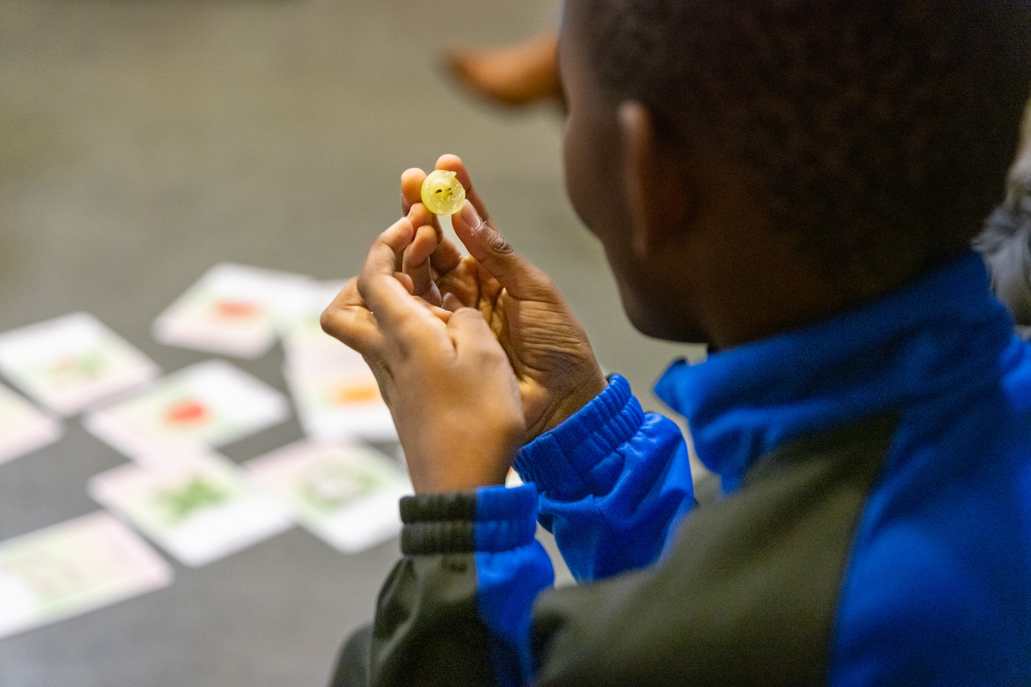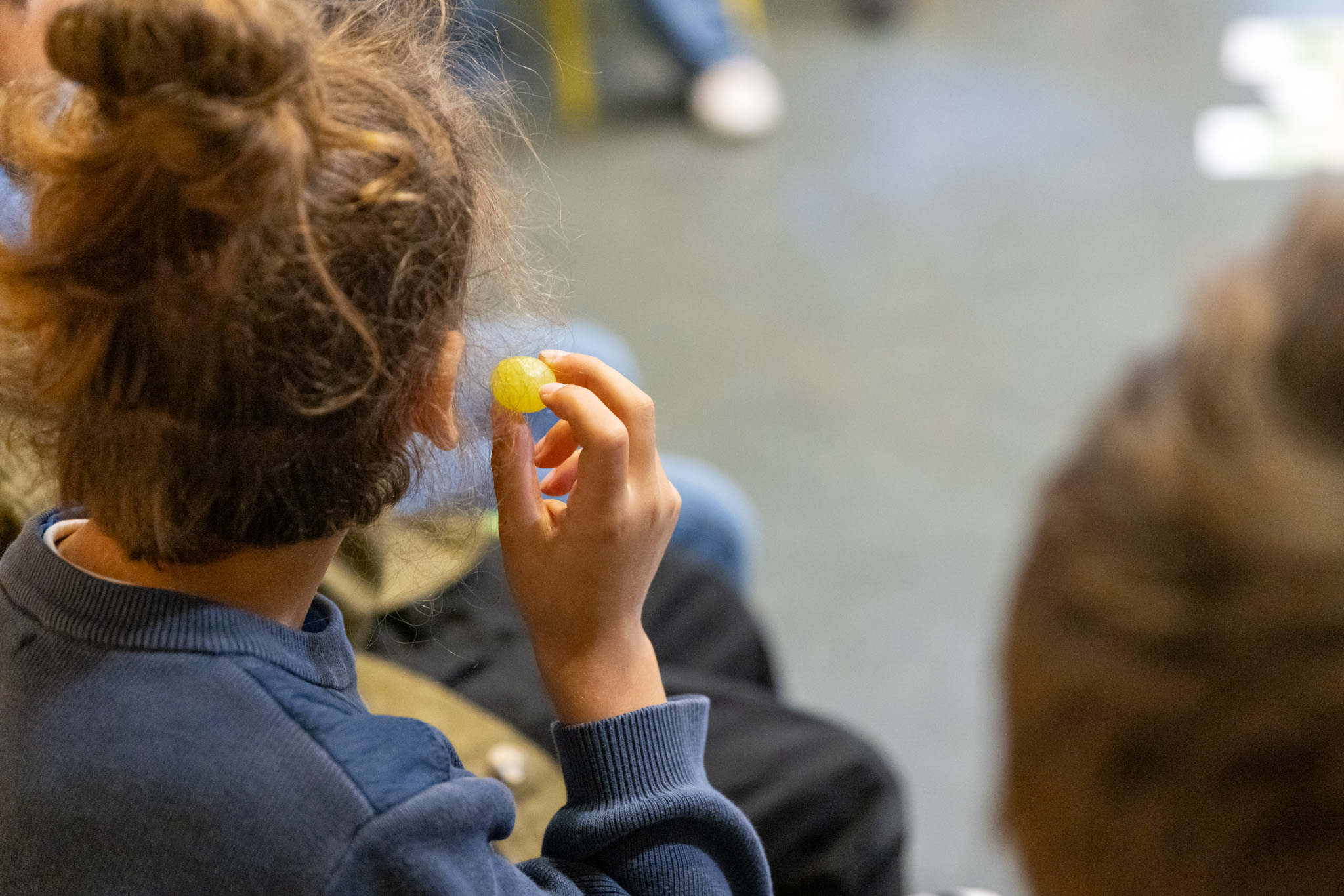 Vient ensuite le moment de la dégustation. Les élèves observent, touchent, sentent, croquent. Ils découvrent le raisin sous toutes ses formes : sa texture, son jus, son croquant. “On mange aussi avec nos yeux et notre odorat”, rappelle l’animatrice.