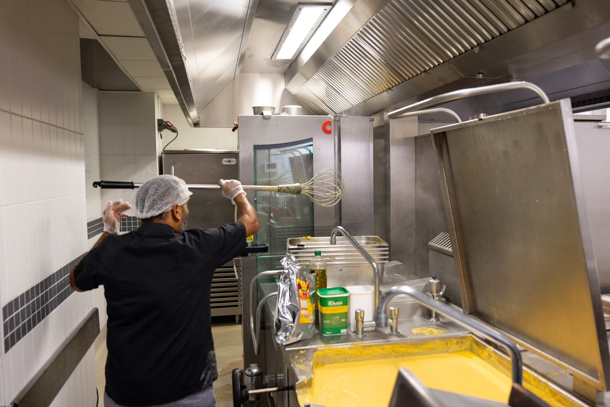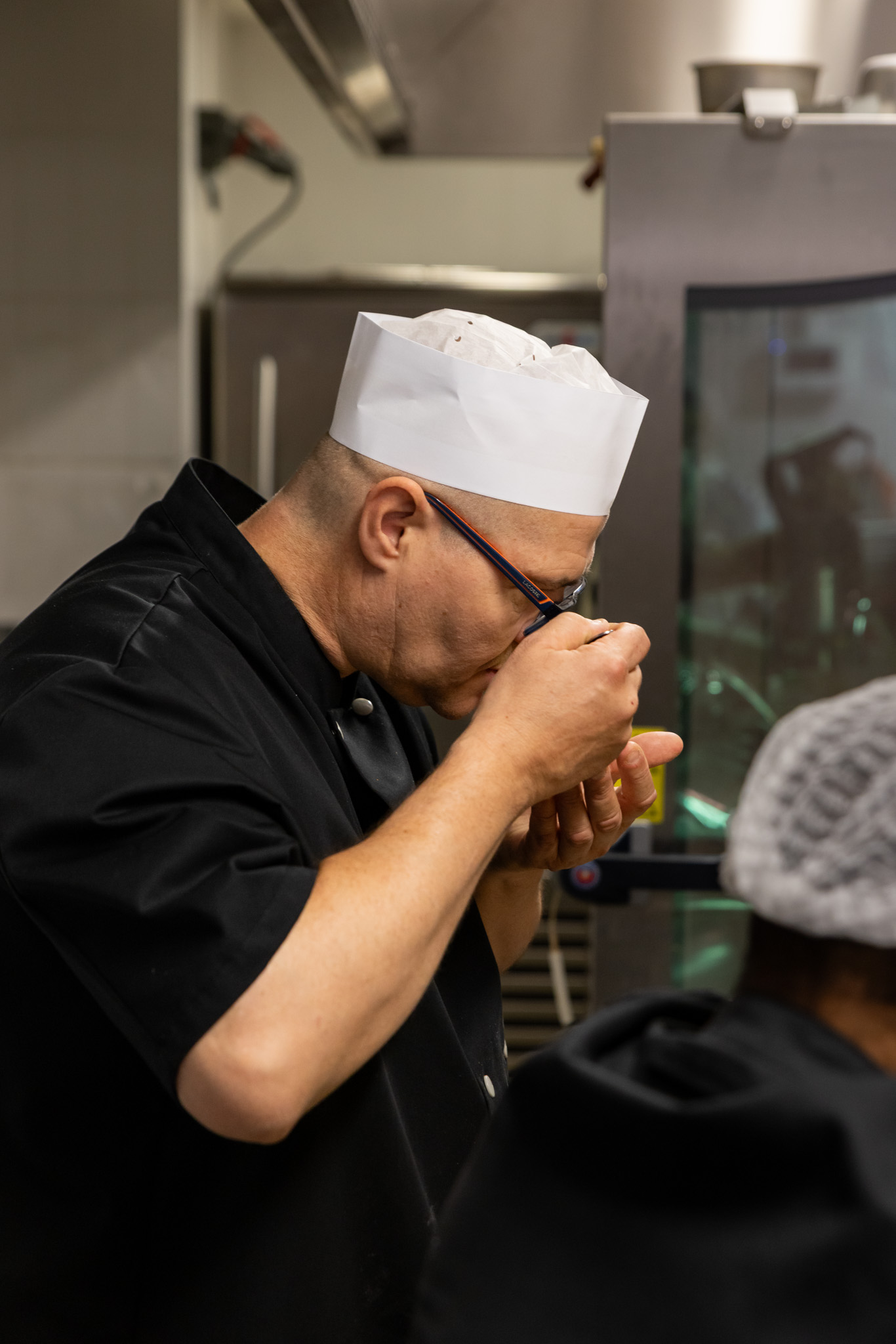 Dans l’effervescence des préparatifs le chef goûte, ajuste l’assaisonnement et nous partages ses précieuses astuces de chef : “Les saveurs ressortent souvent deux ou trois heures après. On goûte, on attend, on regoûte.” Dans le coin, le velouté de butternut onctueux attend d’être conditionné, tandis que des fèves et des carottes mijotent doucement pour le plat du jour.