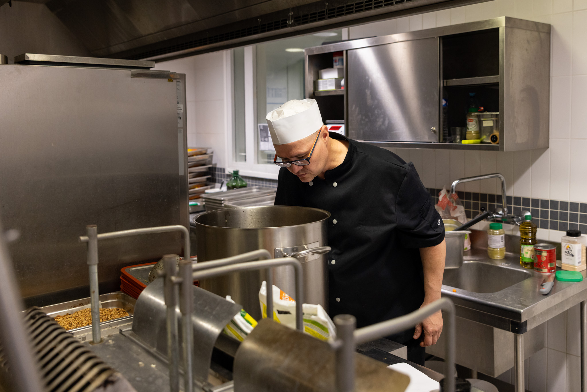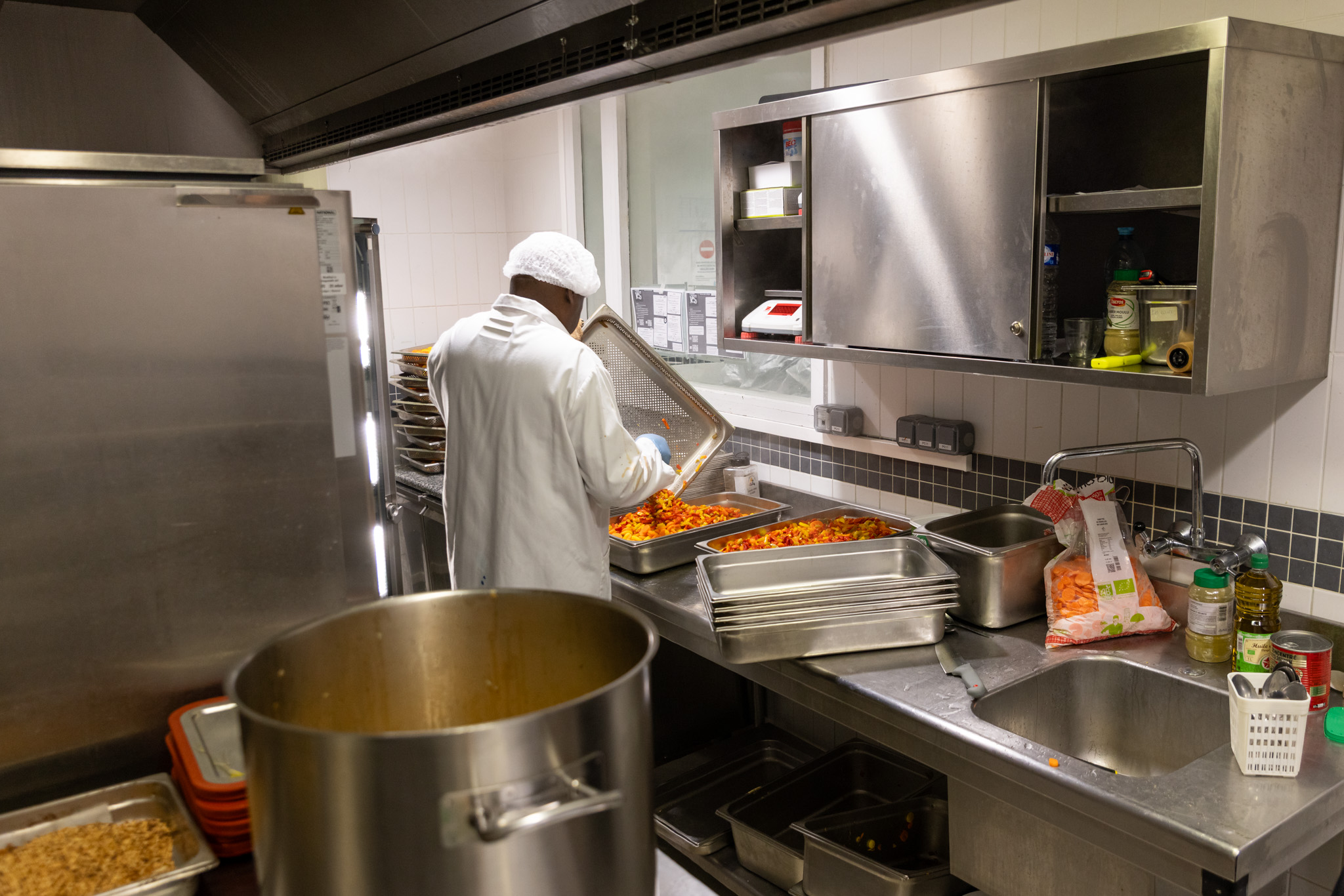 Derrière les fourneaux, le chef Patrick Thiriot, fraîchement arrivé à la tête de la cuisine du collège Aimé Césaire depuis septembre, orchestre les préparatifs. “C’est un peu comme un service en restaurant, sauf qu’ici, on sert 1 200 couverts… et que nos convives ont entre 3 et 11 ans !” lance-t-il en souriant, tout en surveillant la cuisson. Dans cette cuisine parfaitement réglée, chaque geste a son importance. Patrick dirige une équipe de neuf personnes : un cuisinier au chaud, une cuisinière au froid, deux commis, deux plongeurs, un responsable de dispatch et deux agents polyvalents…. Chacun.e à son rôle bien définie : découper, cuire, goûter, conditionner.