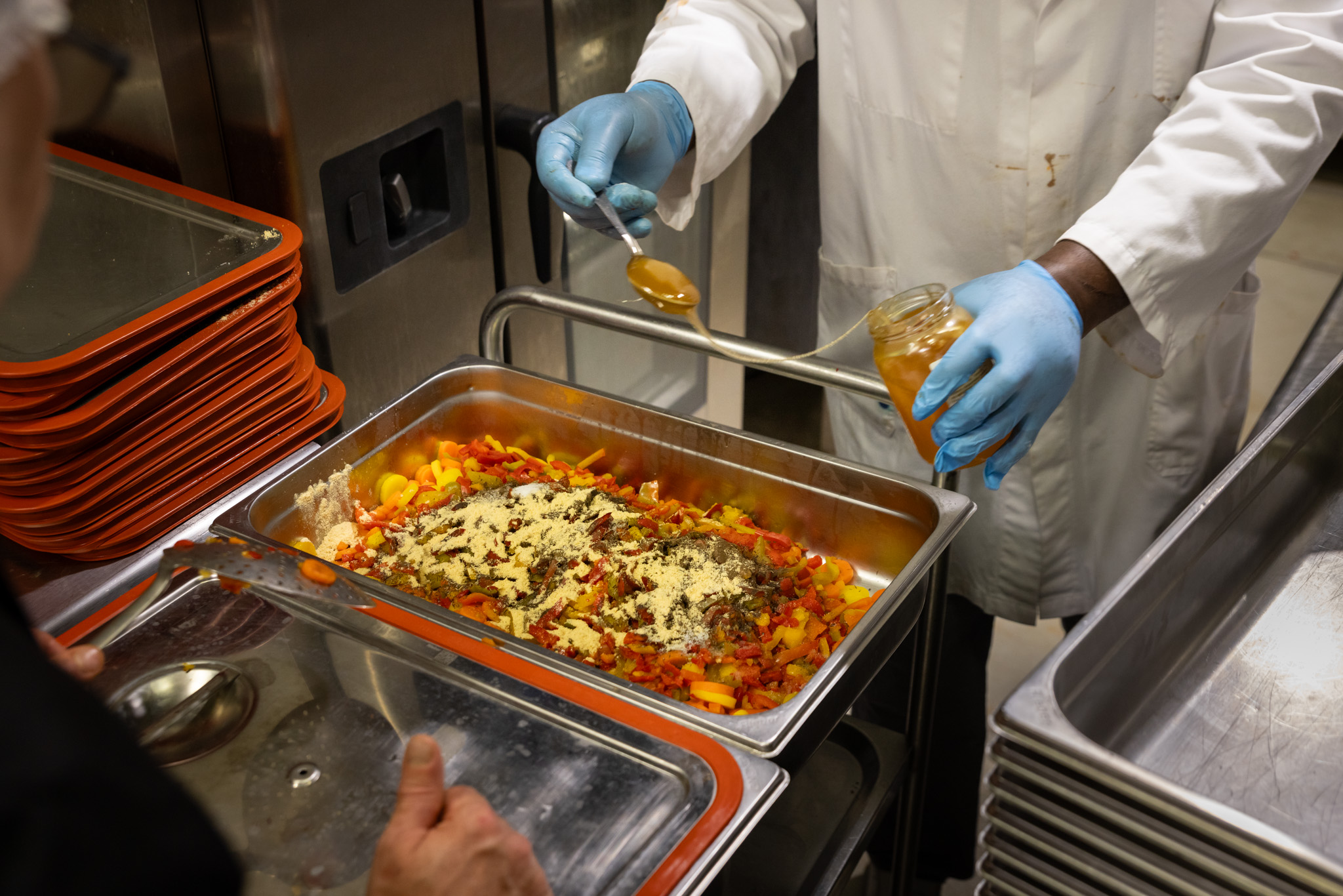Au-delà du menu, le Grand Repas met en avant des valeurs essentielles : la convivialité, le partage, la saisonnalité, les circuits courts et la lutte contre le gaspillage alimentaire. “Pour aujourd’hui, on s’est fourni en circuit court pour plusieurs produits”, précise Patrick. “Le comté vient d’un petit producteur local. Le poulet façon basquaise aussi. La saisonnalité, c’est le cœur du Grand Repas : butternut, carottes, poivrons, miel… tout est de saison.”