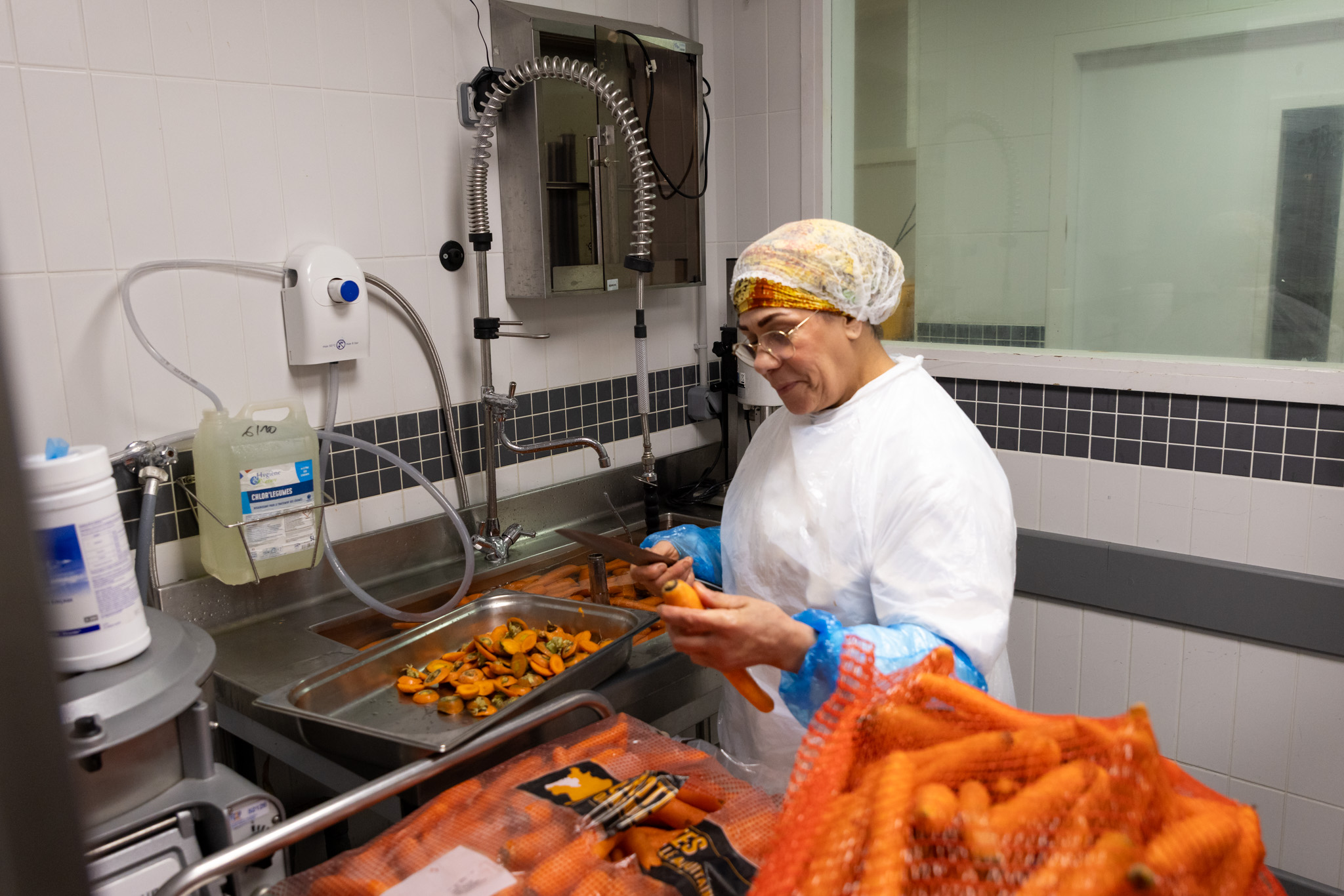 8 heures, jeudi matin. La matinée commence et dans les cuisines, l’effervescence est déjà bien installée. Nous enfilons la panoplie de rigueur : charlotte, blouse, sur-chaussures, avant de pénétrer dans les coulisses de la restauration scolaire. L’air est chaud où flottent des parfums d’oignons revenus et de courges butternut doucement mijotés.