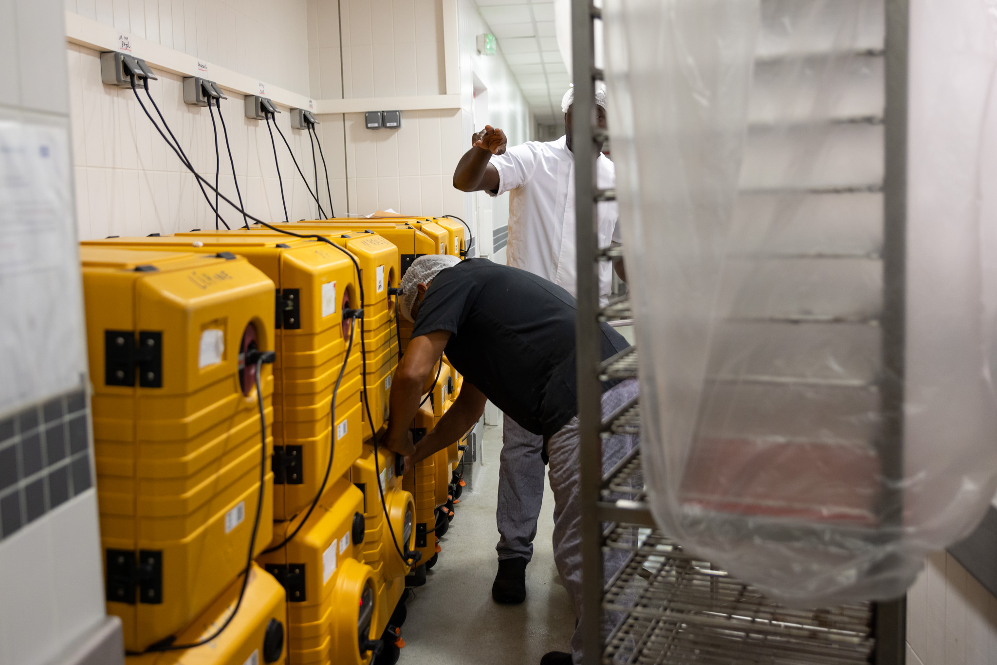 Entre 7h et 10h, la cuisine tourne à plein régime : les plats sont préparés, placés dans des bacs inox à température contrôlée, étiquetés et répartis selon les tournées. Car ici, la logistique est aussi importante que la cuisine. Les 1200 repas doivent être livrés dans les huit établissements du secteur : écoles Pajol, Marx Dormoy, Doudeauville, Philippe de Girard, Jean-François Lépine.… Le tout, à vélo cargo par la structure Cargonautes ! “C’est toute une organisation”, confie Patrick. En plus de la production, il assure la coordination avec tous les restaurants scolaires, veillant à ce que chaque entrée, plat, fromage et dessert parte à l’heure.