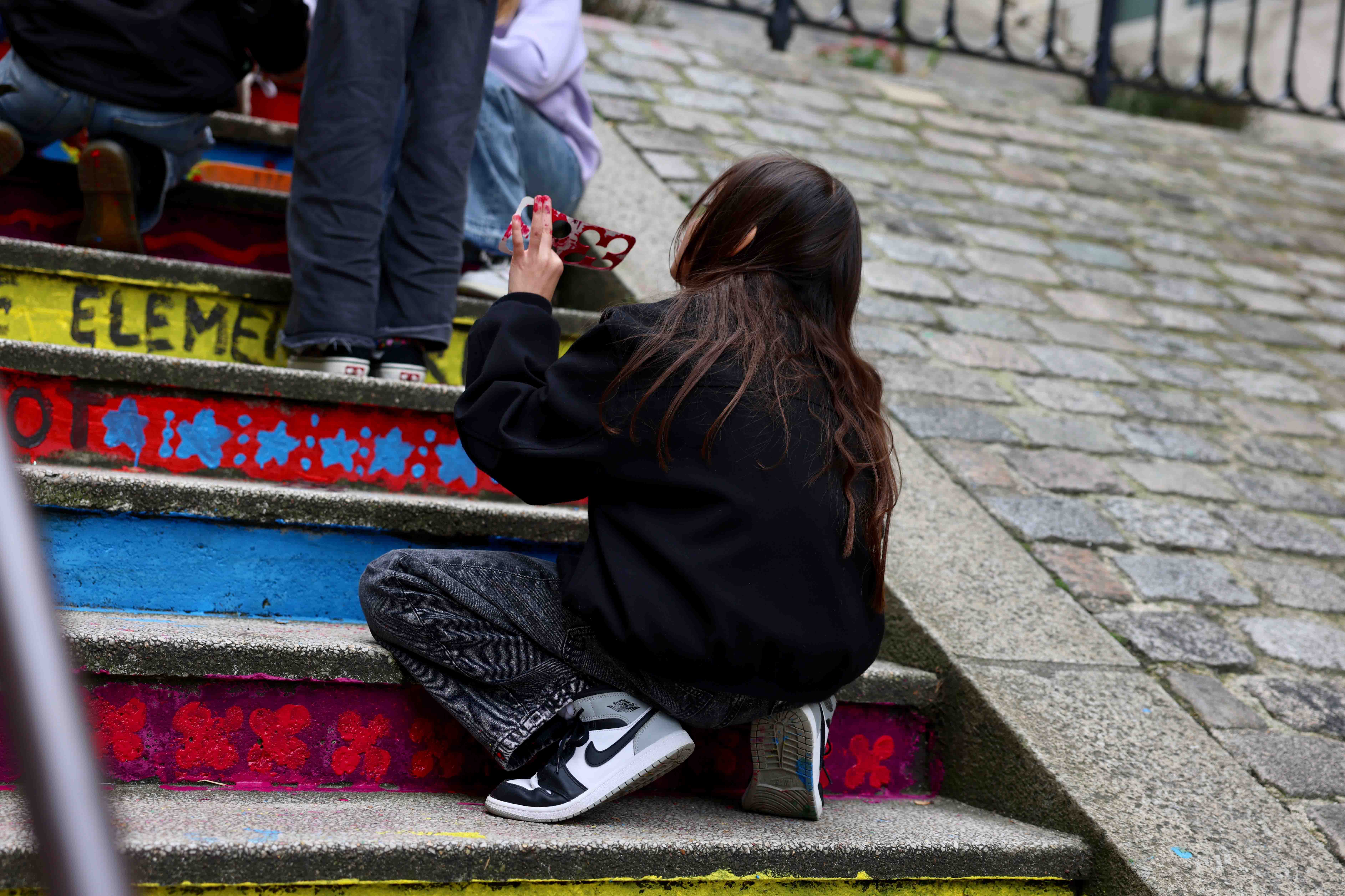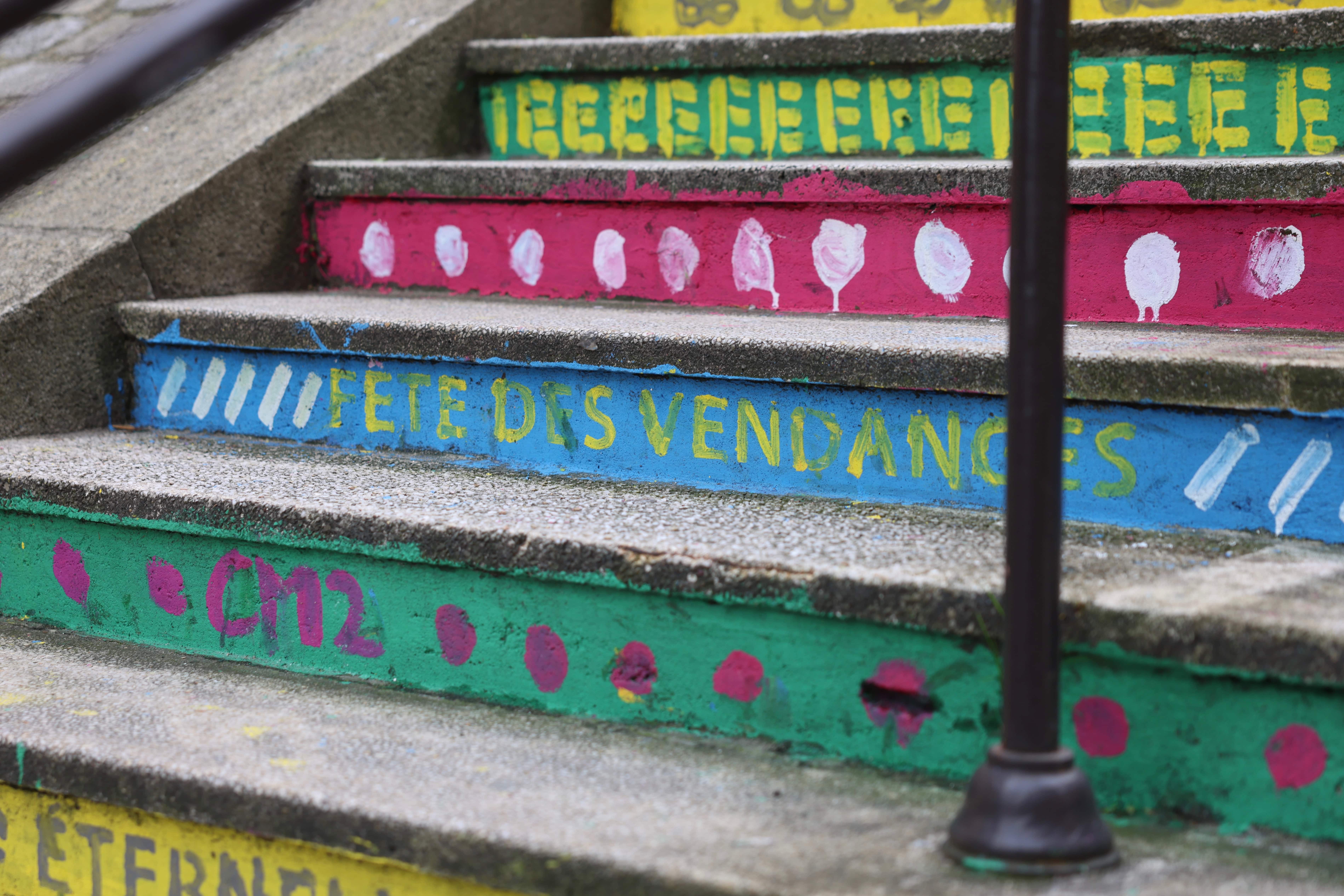 Au-delà des vignes, des concerts et des spectacles, l’événement invite aussi les plus jeunes à investir leur quartier autrement. C’est sur les marches de la rue du Mont-Cenis que les élèves de CM2 de l’école élémentaire Sainte-Isaure ont laissé leur empreinte artistique, guidés par Florence Vautrin, professeure d’arts plastiques. Rencontre.