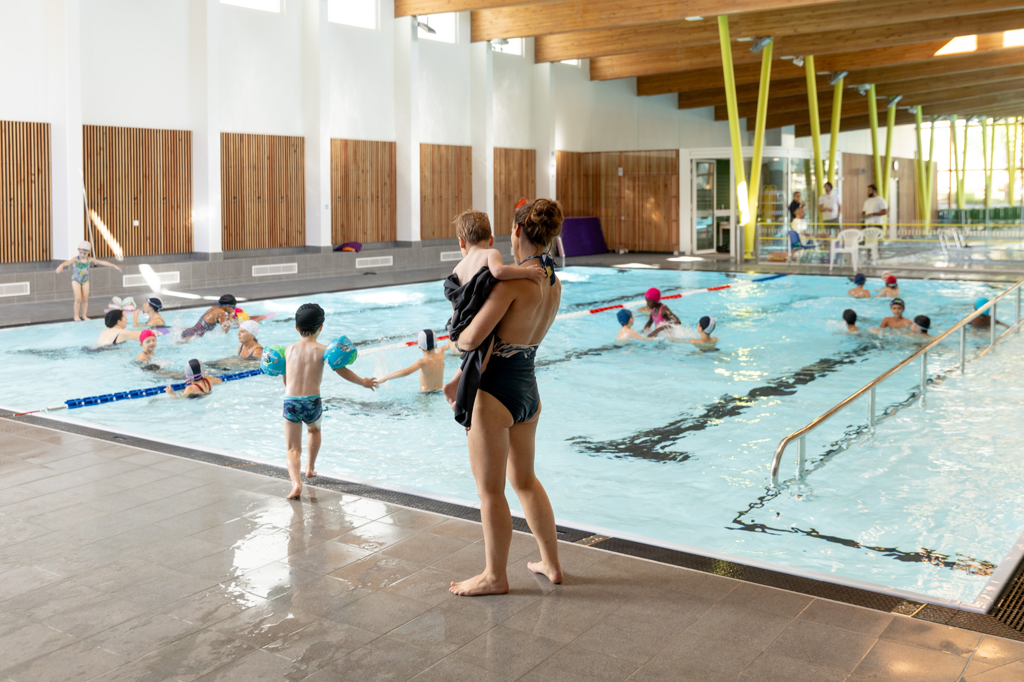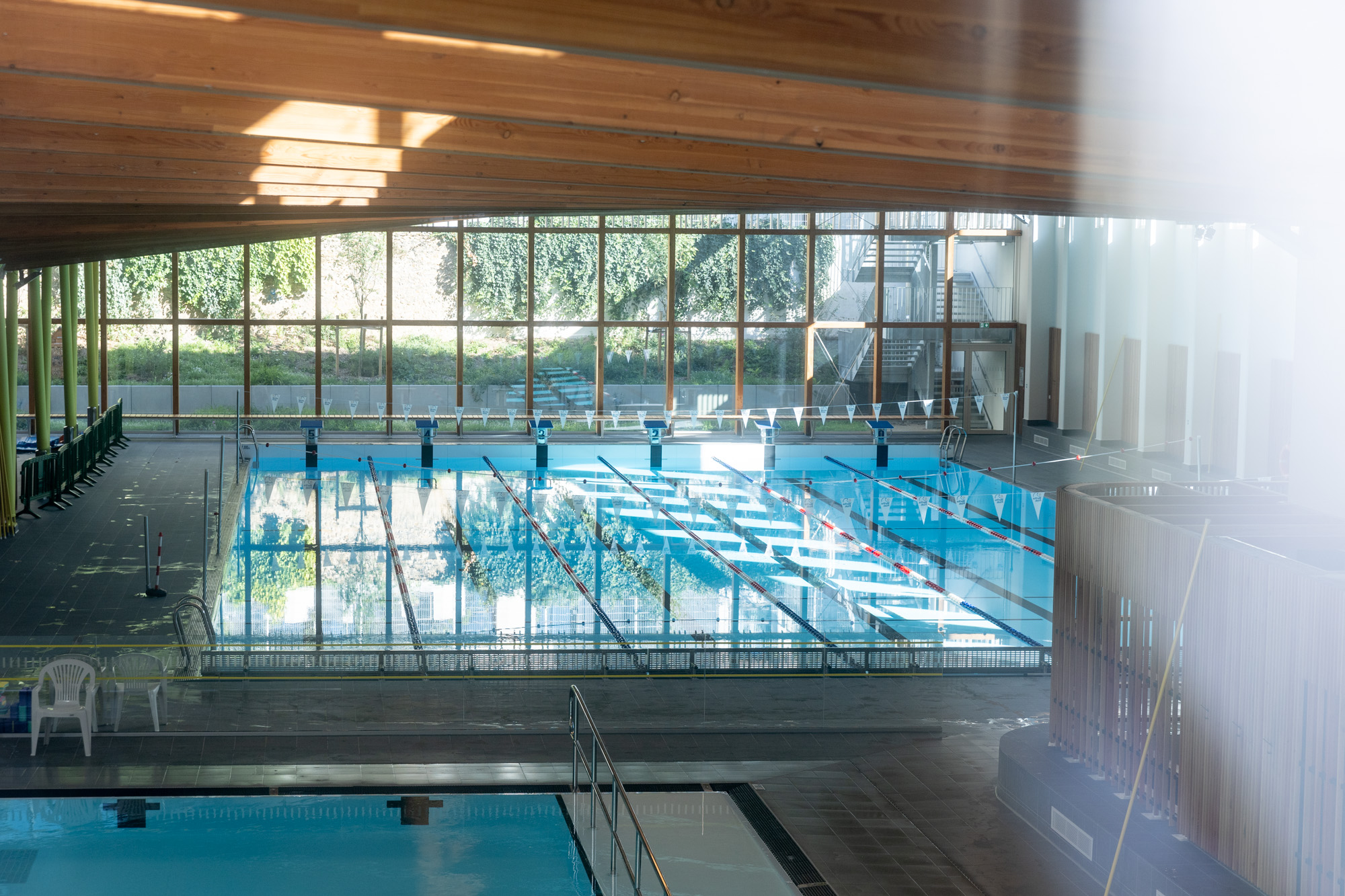 A l’intérieur, deux bassins surplombés d’une charpente de bois (issu de forêts françaises) qui ondule au-dessus de l’eau à 13 mètres de hauteur. Au total, plus de 3 000 m² pour nager ou apprendre à nager. Difficile de résister, même en ce jour de grisaille, à faire quelques brasses