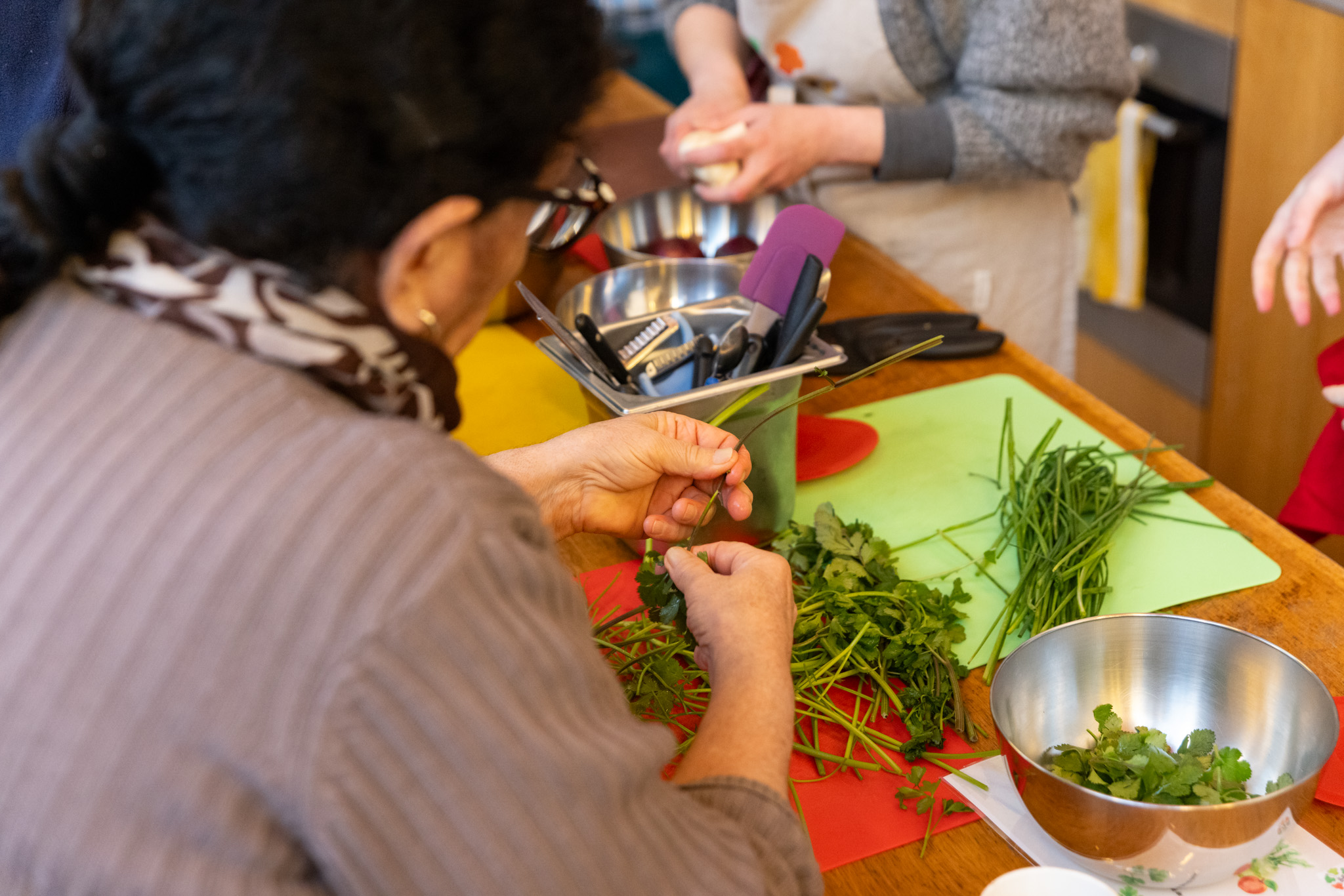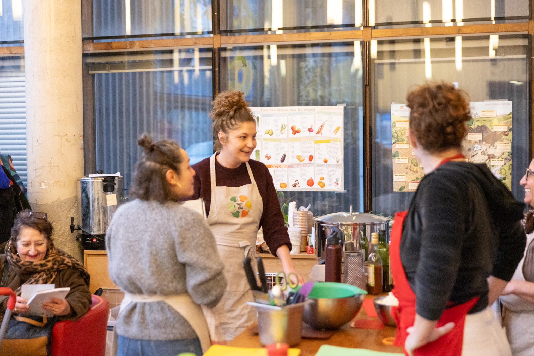 À peine les paniers distribués, les cuisines s’animent. Autour des plans de travail, on épluche, on coupe, on goûte. Aujourd’hui, au menu : soupe maison, tapenade, salade de saison. L’atelier démarre presque naturellement, dans une ambiance détendue.