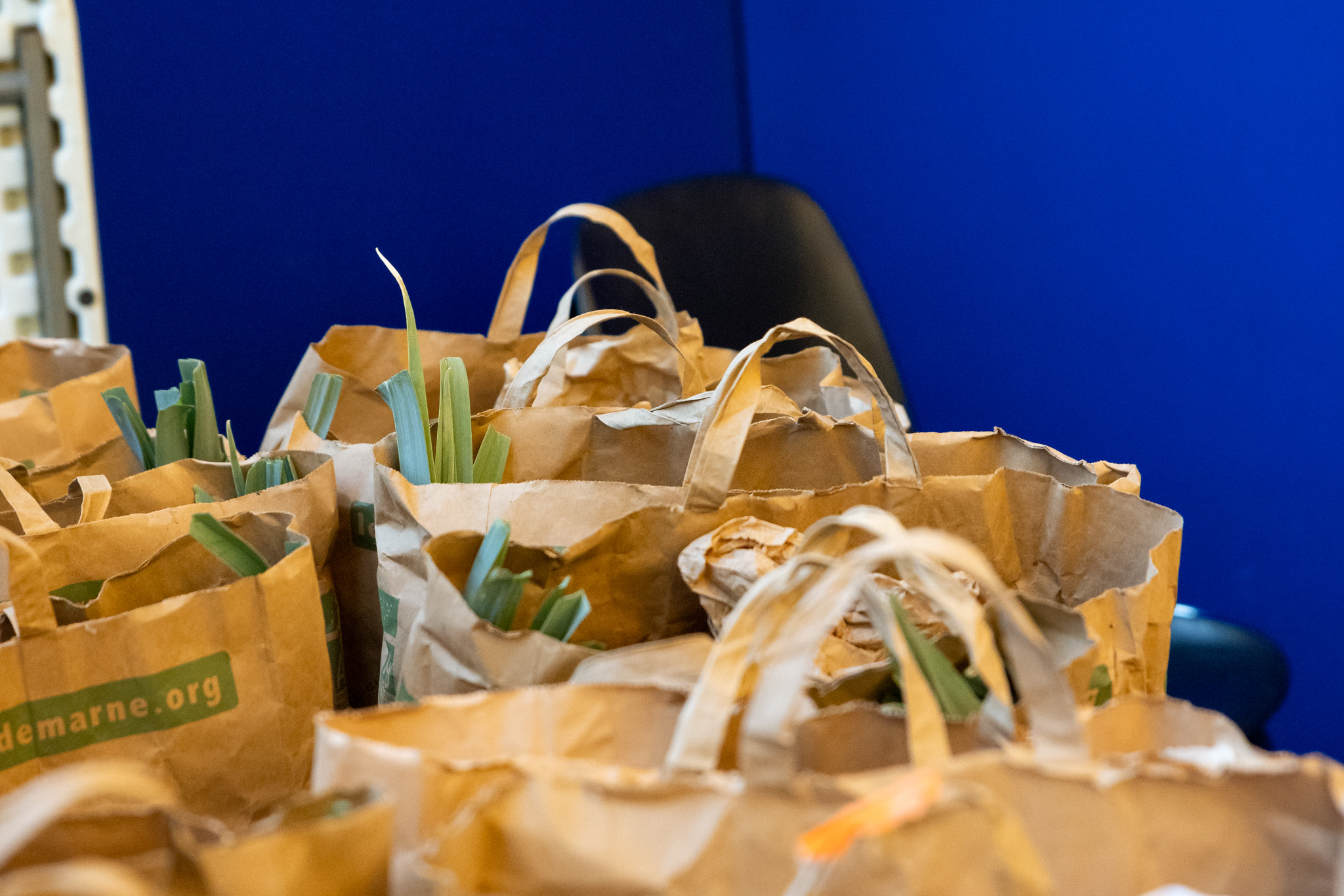 Il est 13h30 à la Maison Bleue. Les paniers viennent d’arriver. Pommes, betteraves, poireaux, blettes : des produits bio, de saison, proposés à prix libre pour s’adapter aux moyens de chacun. Ici, pas de formulaire ni de justification, chacun participe comme il le peut : « Les paniers sont proposés à prix libre, avec plusieurs repères : 3 euros minimum, 7 euros comme prix médian et 15 euros comme prix de référence, permettant à chacun de participer selon ses possibilités. » nous explique Emmanuelle. Le prix s’adapte, sans explication à fournir. L’essentiel est ailleurs : permettre à tous de repartir avec des légumes frais et l’envie de les cuisiner.